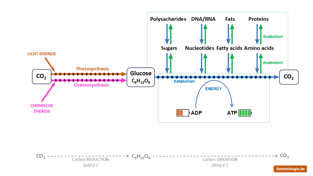 On a planet where there is life, the carbon ofCO2 is massively reduced by that life. On the one hand, to make biomolecules from which the living cell builds its body. On the other hand, to break down (oxidise back) that molecule of reduced carbon and thus harvest energy from it. the diagram below summarises this. We will come back to that diagram further.