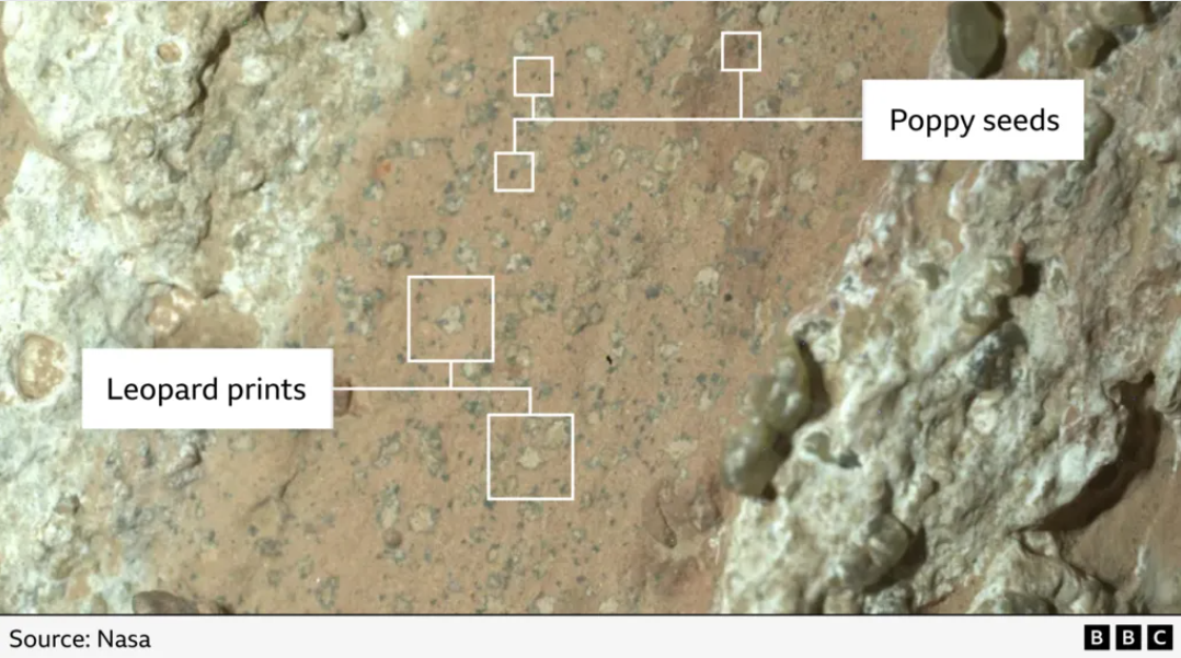 Afbeelding boven: de vlekjes waarover dit nieuws gaat: ‘luipaardvlekjes’ en ‘klaproos zaadjes’. Bron: NASA (Perseverance rover).