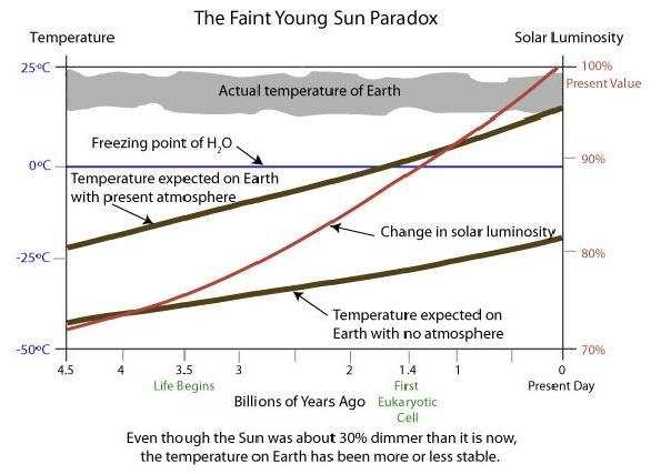 Op bovenstaande grafiek zien we de langzame stijging van de zonne-energie over 4,5 miljard jaar, aangeduid met een rode lijn. De twee dikke zwarte lijnen tonen de berekende temperatuur die de Aarde zou hebben (gemiddelde jaartemperatuur) indien er geen atmosfeer zou zijn (zoals op de Maan) en indien de atmosfeer al die tijd dezelfde zou zijn als tegenwoordig. De gemiddelde temperatuur zou in dat laatste geval onder het vriespunt van water gebleven zijn gedurende de eerste 2,8 miljard jaar! Onderzoek van gesteenten (en isotopen) toont nochtans aan dat de gemiddelde jaartemperatuur al die tijd mooi binnen leefbare grenzen gebleven is. Dit wordt op de grafiek getoond met de bovenste grijze band. Deze voorstelling is schematisch en geeft een stabiele trend weer. Er waren echter ook uitschieters die hier niet getekend zijn, zoals de Sturtiaanse ijstijden en de Marinoaanse ijstijden in de periode 720-635 MA. In de meest extreme ‘snowball Earth’ momenten in die tijd ging de globale gemiddelde temperatuur wel onder het vriespunt. Mogelijk tot -20°C tot -40°C. Het toenmalige (voornamelijk eencellig) leven op Aarde is toen op het randje ontsnapt aan een volledige uitsterving. Op de evenaar en rond plaatselijke actieve vulkanen moet de temperatuur toch boven het vriespunt gelegen hebben, zodat er overlevingszones waren waar fotosynthese ook nog mogelijk bleef. Deze snowball Earth perioden zijn natuurlijk zeldzaam in de hele geologische geschiedenis. We kunnen in elk geval wel besluiten dat de atmosferische samenstelling tijdens de hele geschiedenis genoeg aangepast was om aards leven onophoudelijk te laten voortbestaan. Toch in elk geval sinds het einde van het hadeïcum (vanaf 3,9 GA). Dat is niet zo evident. Een planeet die via positieve feedback mechanismen ontspoort tot een onleefbare situatie is gemakkelijk denkbaar. Venus en Mars zijn eigenlijk in dat geval. Het is echt verbazend dat de Aarde iedere keer net genoeg broeikasgassen vasthield, zodat het niet onleefbaar warm of onleefbaar koud bleef.