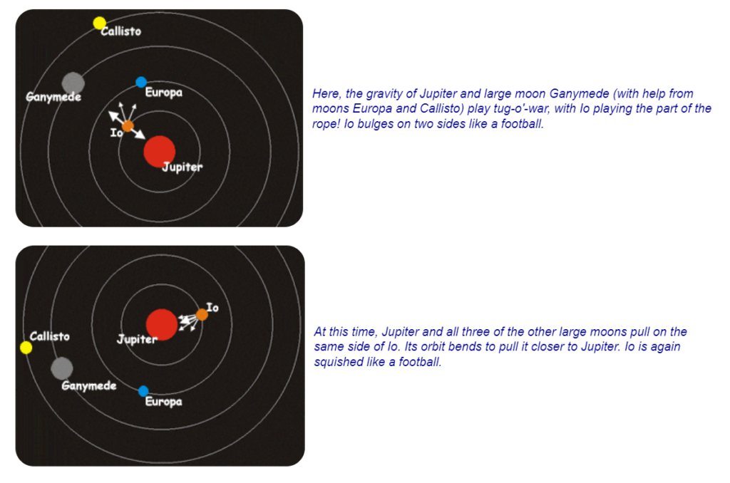 De maan Io laat zien hoe de kernsteen van een ijsmaan er uitziet wanneer de watermantel errond verdwenen is. Io is de enige maan in ons Zonnestelsel met vulkanisme. Er zijn constant uitbarstende vulkanen en lavastromen over de hele oppervlakte. Een foto hiervan staat in de hoofding boven deze tekst.
