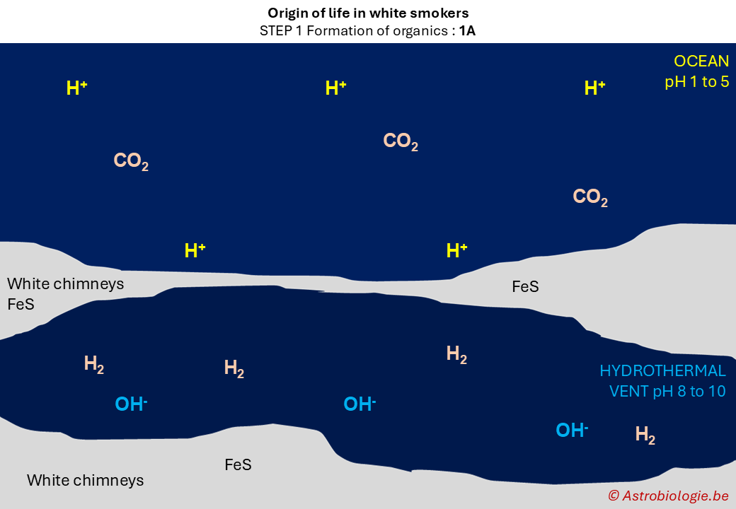 In het boek van Nick Lane (The vital question) wordt uitvoerig beschreven hoe leven zou kunnen ontstaan in de white smokers in verschillende stappen. In de eerst stap zien we dat organische stoffen vanzelf kunnen ontstaan op plaatsen waar het hydrothermale bronwater grenst aan het zure water van de vroege oceaan. Dit gaat als volgt: