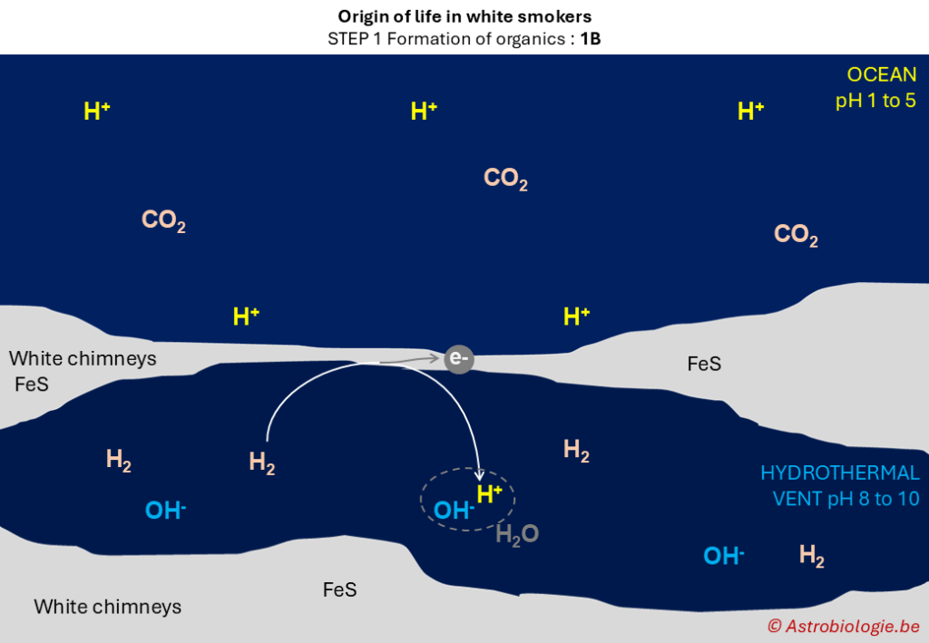 In het alkalisch bronwater zit veel waterstofgas (H2, te zien op figuur 1A). Dit is een product dat voortkwam uit de zogenaamde serpentinisatie: de omzetting van olivijn in serpentijn, wat veelvuldig voorkomt in de buurt van de vulkanisch actieve spreidingszones in de oceaanbodem. Wanneer dit waterstofgas in contact komt met de wanden van de witte schoorstenen, dan zal het ijzersulfide dat daar in zit als katalysator een reactie mogelijk maken, waarbij H2 elektronen afgeeft aan de ijzerrijke wand. Wat in het water overblijft zijn 2 protonen (H+), die meteen reageren met de hydroxide ionen (OH–) in het water. Zulke hydroxide ionen zijn namelijk veel aanwezig in alkalisch water. Zo worden water moleculen gevormd (H2O), dus de protonen die hier gevormd werden kunnen zich niet ophopen. Dit wordt afgebeeld op de figuur 1B.