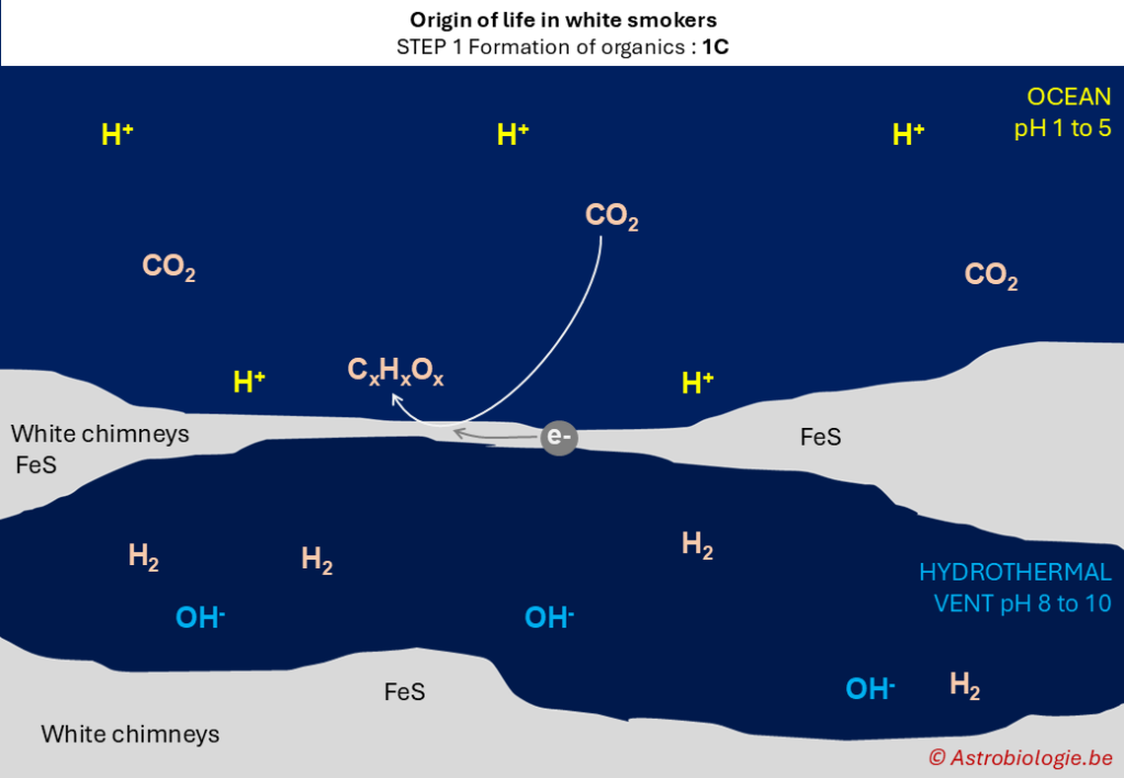 In de ijzerrijke wanden zijn nu elektronen achtergebleven. Deze kunnen zich verplaatsen richting open oceaan, aangezien de wanden geleidend zijn. Aan de oceaankant kan de ijzersulfide (FeS) terug dienen als katalysator, deze keer om de elektronen te laten reageren met het veelvuldig aanwezige CO2. Hier gebeurt dus de koolstofreductie (figuur 1C), en ontstaan de eerste organische moleculen op een spontane manier! Steeds meer en diverse organische moleculen worden aangemaakt, en hopen zich op in de buurt van de witte schoorstenen. De duizenden microkanaaltjes en poriën zorgen ervoor dat deze moleculen een beetje overal binnen en buiten de witte schoorstenen zich verspreiden.