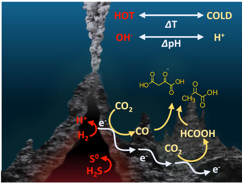 Afbeelding in de hoofding: Schema van de redox chemie in een hudrothermale bron aangedreven door geoelektriciteit.. Bron: Electrochemistry at Deep‐Sea Hydrothermal Vents: Utilization of the Thermodynamic Driving Force towards the Autotrophic Origin of Life – Scientific Figure on ResearchGate. Available from: https://www.researchgate.net/figure/Schematic-image-of-the-redox-chemistry-at-the-vicinity-of-the-hydrothermal-vent-triggered_fig1_329530299