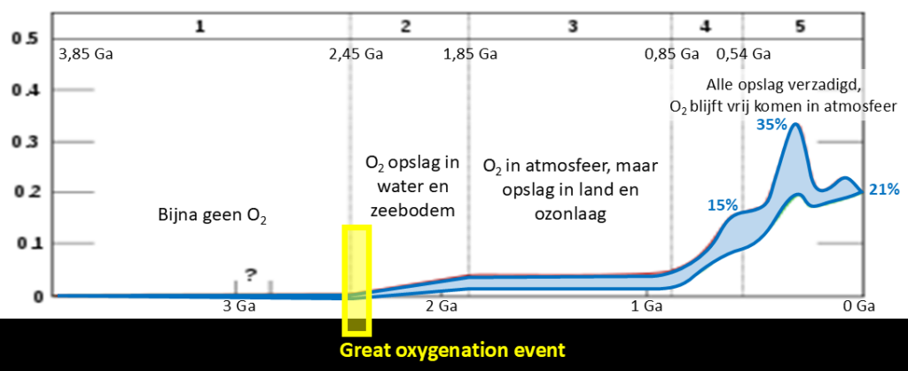 Schatting van de zuurstofconcentratie in de atmosfeer op Aarde. Op de X-as: tijd in ‘miljard jaar geleden’ of Ga. Op de Y-as: partiële zuurstofdruk in de atmosfeer.
